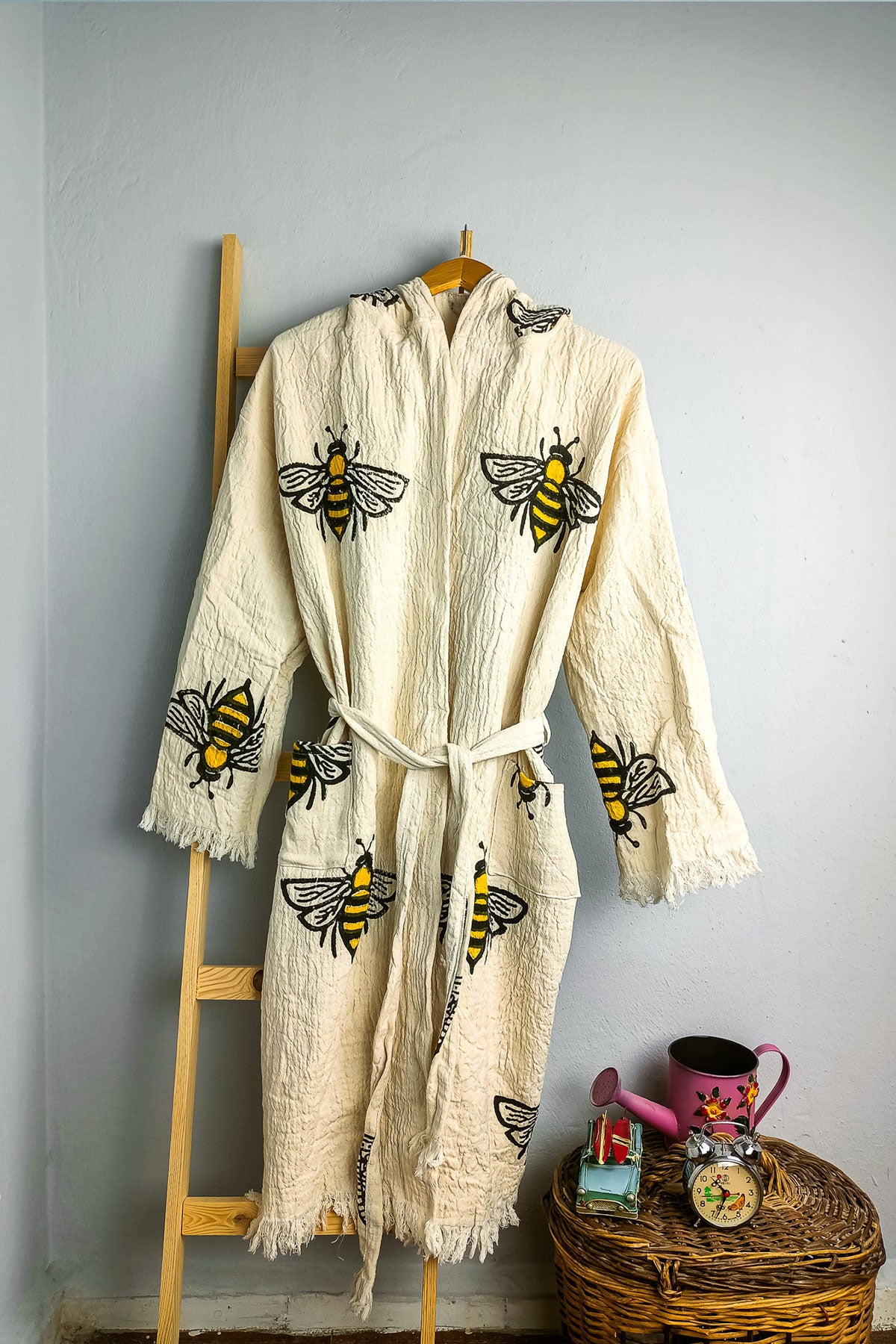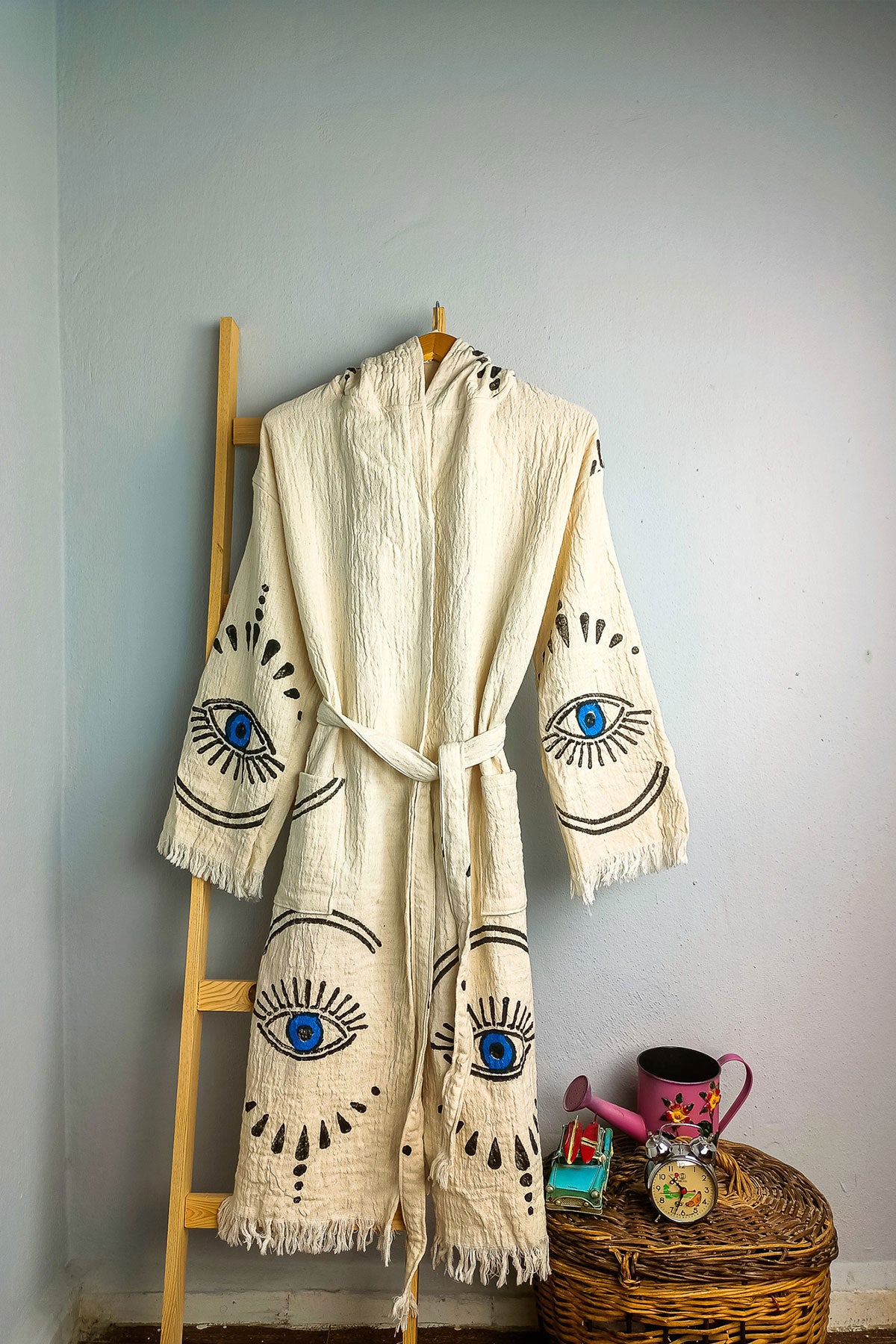 Våra exklusiva morgonrockar är tillverkade av mjuk och andningsbar turkisk bomull. Varje morgonrock har en unik, handgjord design som är både elegant och lekfull. Den lätta och luftiga texturen gör den perfekt för avkoppling efter badet, på spa eller för en skön stund hemma. Välj mellan de charmiga mönstren med sol, arbeta eller det skyddande ögat för en morgonrock som uttrycker din personliga stil. En perfekt blandning av turkiskt hantverk och modern design.