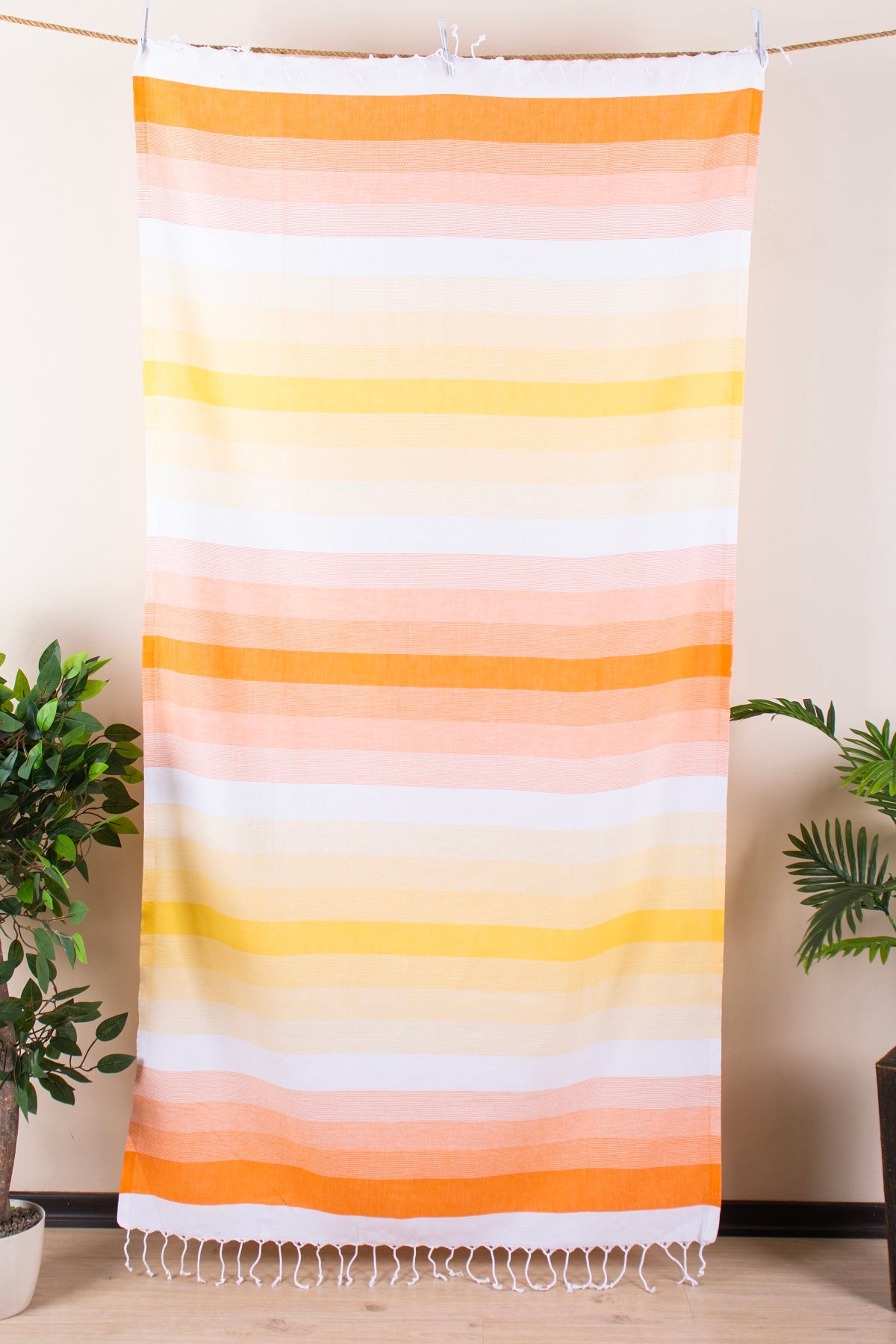 För dig som söker en enkel och elegant skönhet... Denna speciella pestemal kombinerar bomullens naturliga textur med levande färger. De varma tonerna av gult och orange balanseras med vita ränder, vilket ger ett både iögonfallande och lugnt utseende.